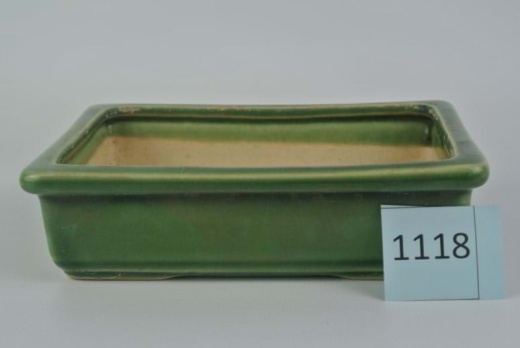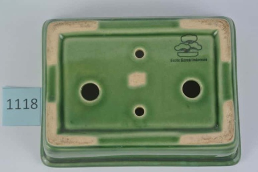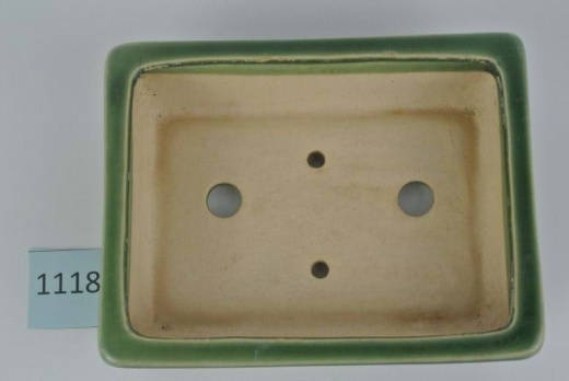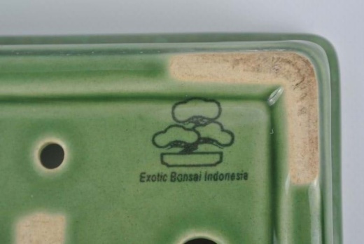 Bonsaischale, grün, rechteckig Die Schale hat an der Unterseite eine "Exotic Bonsai Indonesia"-Inschrift Innenmaße: 14 x 10,5 x 4 cm (Länge/Breite/Höhe) Außenmaße: 15,5 x 12 x 4,5 cm(Länge/Breite/Höhe) 2 Bodenlöcher